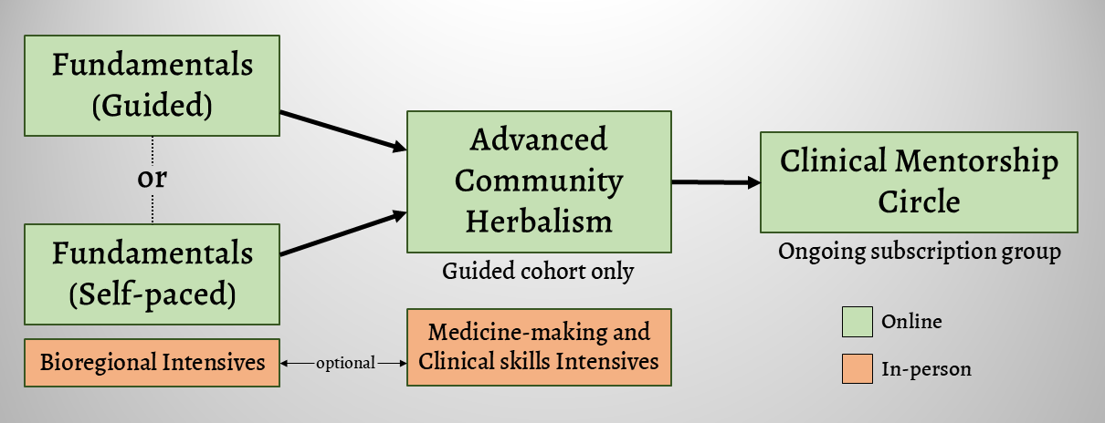 The chart below illustrates how all our programs relate to each other. If you’re new to herbal study, start with our Fundamentals program (Guided or Self-paced). If you’ve already been to school, you might qualify for Advanced.